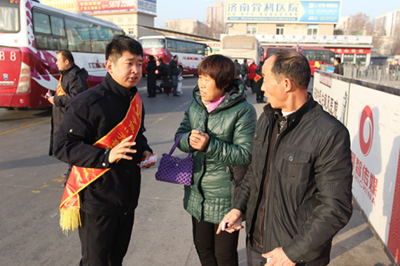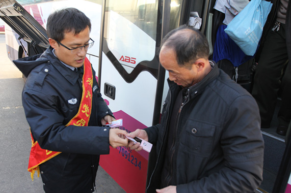 12月26日,總站南區(qū)黨委在旅客到達(dá)區(qū)針對(duì)返程旅客開(kāi)展了營(yíng)銷拓展活動(dòng),向到站旅客派發(fā)印有2016年全年日歷的“感恩回饋會(huì)員卡”,并在客流密集區(qū)進(jìn)行班車(chē)和旅客的疏導(dǎo)和服務(wù)工作,確保服務(wù)區(qū)域內(nèi)車(chē)流、人流暢通有序,秩序井然;同時(shí)還主動(dòng)為旅客搬送貨物、引導(dǎo)貨物辦理業(yè)務(wù);以優(yōu)惠卡為媒介,推廣南區(qū)微信公眾平臺(tái),幫助旅客通過(guò)微信購(gòu)票,享受優(yōu)惠、便捷的售票服務(wù)。