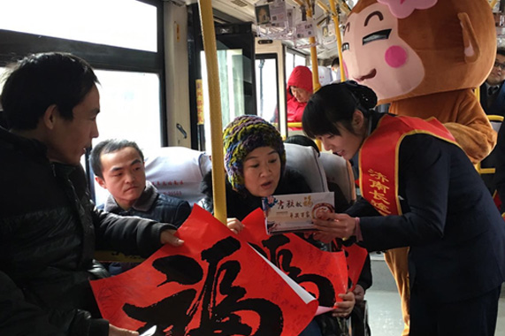 為讓旅客感受到濃厚的過年氣氛和總站南區(qū)溫馨的親情服務(wù),南區(qū)裝扮了兩個卡通“萌猴”和站務(wù)員一起,在候車長廊和班車上為廣大旅客“送?!焙退?。同時,還向乘車旅客贈送“吉候送?!?span lang=EN-US>2016新春VIP打折卡,讓廣大旅客的回鄉(xiāng)之旅充滿吉祥和歡樂。
