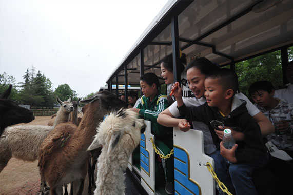在建成不久的新濟(jì)南野生動(dòng)物世界,福娃們在“愛心爸媽”的細(xì)心呵護(hù)下,乘坐小火車觀光游覽,與野生動(dòng)物“親密接觸”,零距離觀察和了解麋鹿、斑馬、駱駝等動(dòng)物的生活環(huán)境與生活習(xí)性,并興致勃勃地觀看了精彩紛呈的動(dòng)物表演,歡樂的笑聲回蕩在整個(gè)公園。